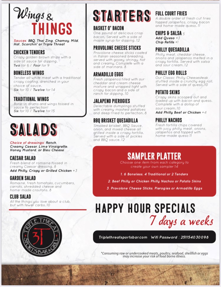 Welcome to Triple Threat Sports Bar in Midland, TX, where mouthwatering flavors meet a vibrant atmosphere! This venue is not just a sports bar; it's a culinary experience that celebrates classic dishes with a twist. Start your meal with Cheese Sticks, perfectly crispy and served with warm marinara, or dive into the smoky delight of Armadillo Eggs, featuring jalapeños wrapped in bacon.